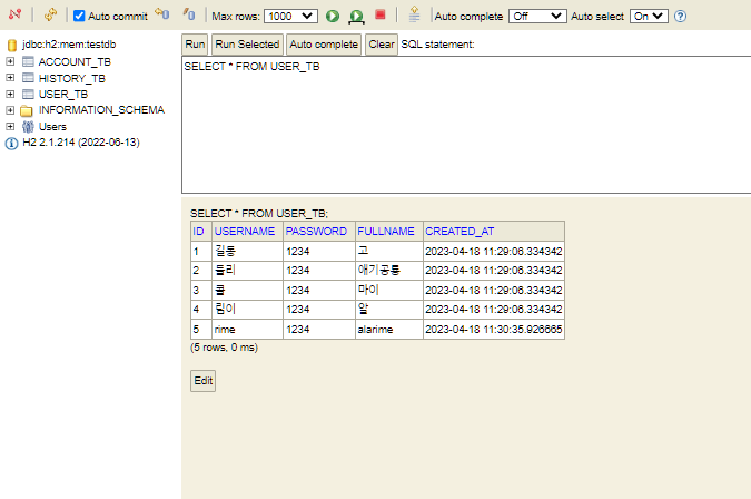회원가입창에 값을 입력하고 db에 들어오는지 확인한다.
